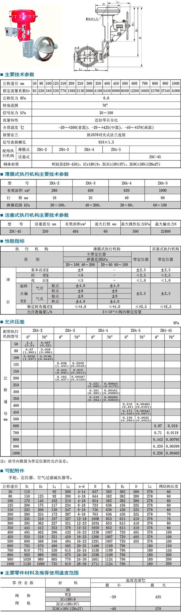| 公称通径mm | |50|80|100|125|150|200|250|300|350|400| | | |450|500|600||700|800|900|1000| | | 公称压力MPa | 0.6 | | 介质温度`C | -20~+200(常温),-40~+450(中温),-40~+600(高温) | | 阀体材质 | WCB(ZG230-450),1Cr18Ni9,ZG1Cr18Ni9Ti,ZG0Cr18Ni12Mo2Ti | |