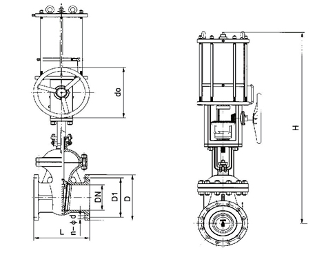 | GB标准外形及连接尺寸(PN1.0Mpa) Outline and Connecting Size to GB Standard (PN1.0Mpa) | ANSI标准外形及连接尺寸(Class150) Outline and Connecting Size to ANSI Standard (Class150) |