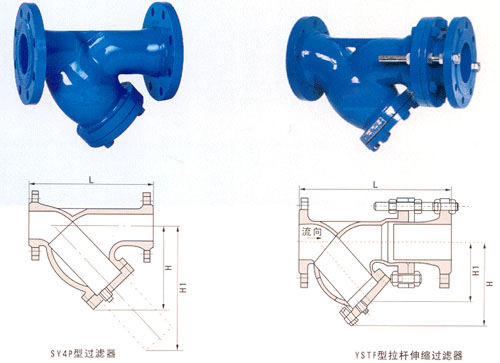 产品概述 Y型过滤器,是使用水力控制阀及精密的易堵塞的机械产品所具备的过滤设备。通常安装于水力控制阀等设备的进口端,防止颗粒性杂质进入通道,造成墙塞,使阀门或其他设备失灵而不能正常使用。Y型过滤器结构简单,流阻小,可在线排除污物而不需拆除。Y型拉杆伸缩过滤器还具有安装长度可调,装拆方便的特点。可根据需要设置滤网目数,通常范围:水18~30目、蒸气40~100目、油100~480目。 技术参数 单位:mm | 型号 | 公称压力PN(Mpa) | 壳体试验压力(Mpa) | 工作压力(Mpa) | | SY4P | 1.0 | 1.5 | 1.0 | | YSTF | 1.6 | 2.4 | 1.6 | 主要零部件材料 单位:mm | 零件名称 | 管体 | 滤网 | 伸缩拉杆 | O形圈 | | 材料 | 灰铸铁或球墨铸铁铸钢 | 不锈钢 | 碳钢镀锌 | 丁腈橡胶 | 主要外形连接尺寸 单位:mm SY4P-10/16/25型 | DN | 65 | 80 | 100 | 125 | 150 | 200 | 250 | 300 | 350 | 400 | 450 | 500 | | L | 螺纹 | | | | | | | | | | | | | | 法兰 | 250 | 280 | 350 | 400 | 440 | 500 | 580 | 670 | 780 | 850 | 850 | 100 | | H | 螺纹 | | | | | | | | | | | | | | 法兰 | 198 | 210 | 250 | 305 | 358 | 450 | 503 | 578 | 598 | 618 | 693 | 765 | | H1 | 螺纹 | | | | | | | | | | | | | | 法兰 | 270 | 295 | 344 | 422 | 485 | 602 | 710 | 815 | 844 | 872 | 978 | 1080 | YSTF-10/16型 | DN | 50 | 65 | 80 | 100 | 125 | 150 | 200 | 250 | 300 | 350 | 400 | | L | 300 | 320 | 380 | 430 | 500 | 550 | 650 | 775 | 900 | 1025 | 1150 | | H | 155 | 183 | 210 | 250 | 305 | 358 | 450 | 503 | 578 | 598 | 618 | | H1 | 195 | 245 | 295 | 344 | 415 | 485 | 602 | 710 | 815 | 844 | 872 |