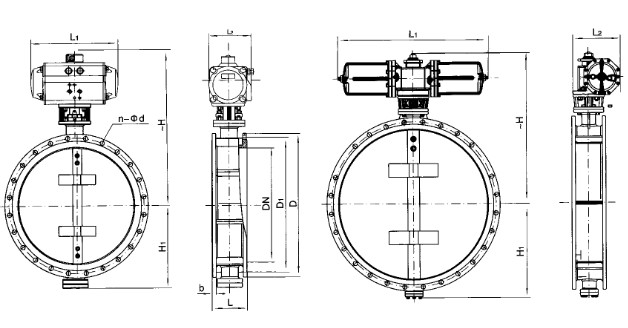 阀盖形式分为标准型和外轴承型二种,标准型适用于口径DN500以下,外轴承型适用于口径DN600以上。执行机构采用进口的双活塞气动执行机构,具有输出力大而平稳、机构轻巧、重量轻等优点。