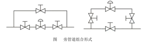 (5)为了在调节阀出现故障时不影响生产和发生安全事故,一般都需要安装旁路管线(旁通管道组合形式见下图)。对于高温、高压、易冻、易堵和粘稠介质,还应安装排泄阀。
