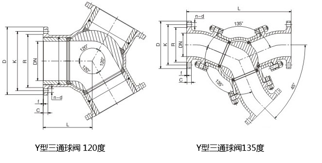 Y型三通球阀有相互成120°和两通孔成135°,根据需要可实现对介质流向切换,能比相互垂直的两个通道三通球阀流阻更小。