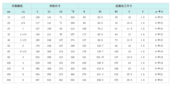 公称通径(mm) | 15 | 20 | 25 | 32 | 40 | 50 | 65 | 80 | 100 | 125 | 150 | 200 | 250 | |