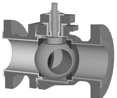 主要由衬氟阀体、衬氟球阀和阀座、上阀盖、填料等零件组成。阀体流道形状有O形和V形两种。O形球阀的流量特性为快开,一般用于两位式切断场合;V形球阀的流量特性为近似等百分比,用于调节阀场合。根据需要,还可定做矩形流道口,用于需直线特性的调节场合。