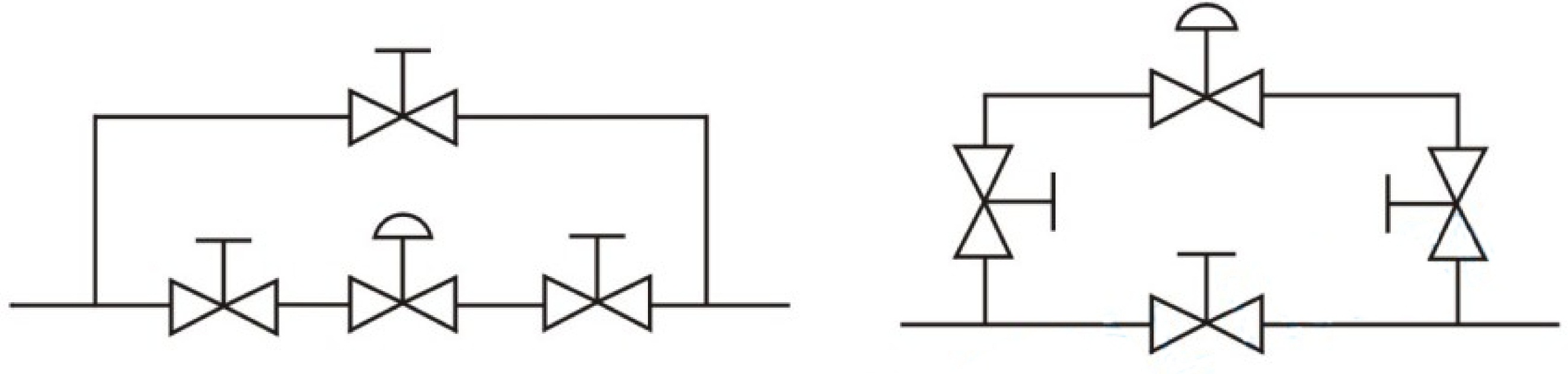 (5)为了在调节阀出现故障时不影响生产和发生安全事故,一般都需要安装旁路管线(旁通管道组合形式见下图)。对于高温、高压、易冻、易堵和粘稠介质,还应安装排泄阀。