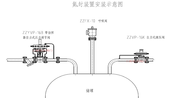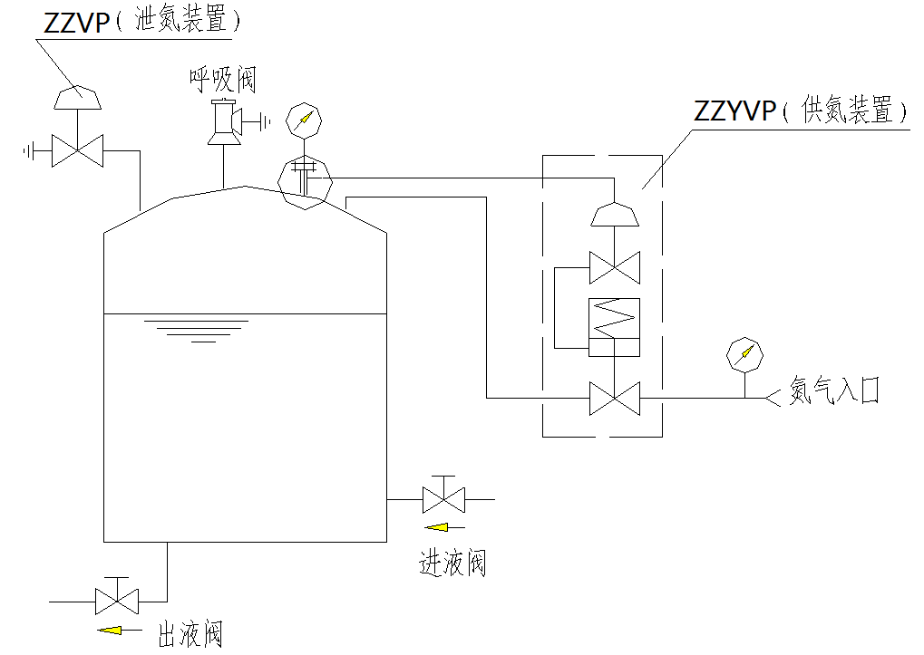 氮封装置示意图中贮罐内成品油上端覆盖氮气,其压力一般在100mmH2O左右,通过氮封保护器控制。出液阀开启放油时,贮罐内液位下降,此时ZYVP供氮调节阀开度增大,向罐内补充氮气使压力增加至设定值。进液阀开启进油时,液位上升,气相部分容积减小,氮气压力上升,此时ZYVP供氮调节阀关闭,而ZZVP泄氮调节阀在压力控制器作用下开启,排出氮气使压力降至设定值,压力设定值比供氮阀要高。而呼吸阀的呼气压力设定值比ZZVP泄氮高。