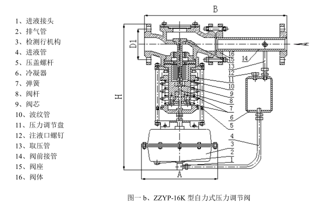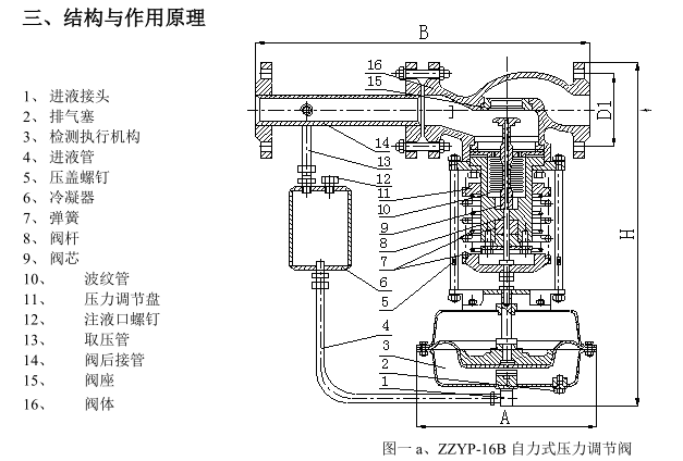 调压阀主要有检测执行机构、调压阀、冷凝器与阀后接管等腰三角形四部分组成,其结构(见图一)。