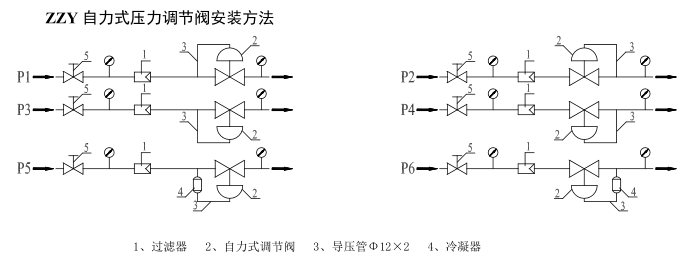 P6:调节蒸气,阀后压力调节(B型),应装冷凝器(4),建议装过滤器(1)