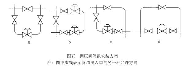 (3) 为便于现场维修及操作,调压阀四周应留有适当空间,阀前后应设置截止阀与旁路手动阀,如图五所示。