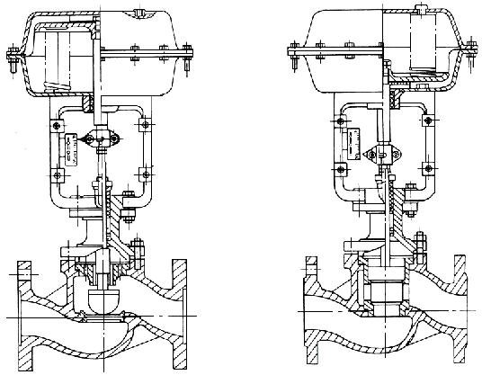 NBKVHP型和NBKVHM型气动调节阀按照开关方式的不同可分为气关式和气开式两种。气关式阀由正作用执行机构和阀构成。当输入信号压力由下限值改变为上限值时,阀从全开到全关。气开式阀由反作用执行机构和阀组成,当输入信号压力由下限值改变为上限值时,阀从全关到全开。它们分别如图1(a)和图1(b)所示。