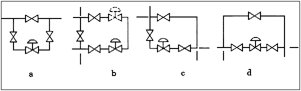 (4) 调节阀组:一般在工艺过程配管中均安装切断阀的旁路阀与调节阀配成阀组,以适应设备连续操作的需要。维修调节阀时用切断阀隔离。用旁路阀调节。下面图4中推荐四种调节阀组布置方式。